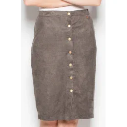 Módna ceruzková sukňa v midi dĺžke zo semišu. Charakteristickým znakom sukne je množstvo ozdobných gombíkov, ktoré sa tiahnu po celej dĺžke sukne.