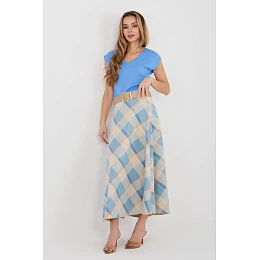 Elegantná maxi sukňa so stupňovitým strihom, ktorá je ideálna na každodenné outfity aj pracovné komplety. Model má klasický károvaný vzor, ktorý dodáva celkovo elegantný a nadčasový charakter. Sukňa má pohodlný elastický pás, ktorý sa dobre prispôsobí postave a zaručuje pohodlie počas celého dňa. Ďalším prvkom je šnúrka v páse, ktorá zvýrazňuje pás a vytvára štýlový doplnok modelu. Maxi dĺžka a stupňovitý strih zaručujú, že sukňa pri pohybe krásne padá a dodáva outfitu ľahkosť a ženskosť. Je vyrobená z polyesteru a elastanu, je odolná, mierne elastická a pohodlná na nosenie. Model bez zapínania zaručuje rýchle a jednoduché obliekanie.