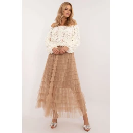 Táto elegantná tylová sukňa s volánikmi je štýlovým návrhom na každodenné nosenie, do práce, ako aj na slávnostné príležitosti alebo večierky. Je vyrobená z ľahkého polyesteru, má hladký vzor a midi dĺžku, čo jej dodáva ženský a elegantný vzhľad. Jemné volániky dodávajú sukni romantický charakter a podčiarkujú jej elegantný štýl. Konštrukcia bez gombíkov a elastický pás zaručujú pohodlie pri nosení a podšívka zaručuje komfort a zabraňuje vyhrňovaniu. Jedinečná sukňa, ktorá spája jemnú eleganciu s praktickosťou, je ideálna na rôzne príležitosti.
