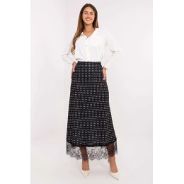Elegantná a ženská sukňa v midi dĺžke, vyrobená z materiálu príjemného na dotyk, polyesteru s prídavkom elastanu, ktorý zaručuje pohodlie pri nosení a ideálne prispôsobenie sa postave. Model je v spodnej časti zdobený jemnou čipkou, ktorá mu dodáva eleganciu a jemný charakter. V páse je elastický pás, vďaka ktorému sa sukňa dokonale prispôsobí pásu a nezapína sa. Materiál zdobí moderný bodkovaný vzor, ktorý dodáva celému kúsku ľahkosť a šarm. Ide o univerzálny model, ktorý je vhodný na každodenné nosenie, do práce aj na špeciálne príležitosti.