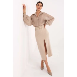 Elegantná, štýlová sukňa v midi dĺžke, ktorá je ideálna na spoločenské udalosti, večierky a večerné vychádzky. Materiál je vyrobený zo zmesi viskózy a nylonu, je príjemný na dotyk, mierne elastický a krásne sa prispôsobí postave. Dominantný jednofarebný vzor zdôrazňuje klasický, nadčasový charakter modelu. Sukňa má vpredu rozparek, ktorý jej dodáva moderný ženský akcent a zároveň zabezpečuje voľnosť pohybu. V páse sa nachádza sťahovací pás, ktorý umožňuje ideálne prispôsobenie a zdôrazňuje ženskú siluetu. Celkovo sa sukňa zapína na skrytý zips, čím sa zachováva elegantný minimalistický vzhľad.
