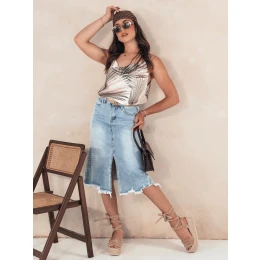 Sukňa STELLIS je možnosťou, s ktorou môžete vytvoriť mnoho vzhľadov, ležérnych aj sofistikovanejších. Má rozparok v spodnej časti predného dielu. Je vyrobená z mäkkého denimu, vďaka čomu krásne zvýrazňuje siluetu a je mimoriadne pohodlná.