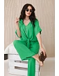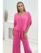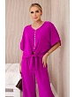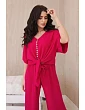 Tentotaliansky komplet s blúzkou s predným viazaním a širokými nohavicami je ideálnou voľbou pre ženy, ktoré ocenia pohodlie a štýl v jednom. Blúzka sa vpredu zapína na gombíky, čo jej dodáva jemnú ženskosť. Široké nohavice sú vyrobené z látky príjemnej na dotyk pre voľnosť pohybu a pohodlné nosenie. Takýto komplet si môžete obliecť na rôzne príležitosti - do práce, na rande alebo na stretnutie s priateľmi. V kombinácii s elegantnými topánkami a doplnkami, ako je kabelka alebo šperky, vytvoríte štýlový a módny vzhľad. Veľkosť je univerzálna a hodí sa pre dámy veľkosti S, M alebo L.