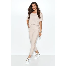 Ľahká a vzdušná dámska tepláková súprava s blúzkou s krátkym rukávom. Ideálna súprava do práce, na nákupy alebo na stretnutie s priateľmi. Dámska nadrozmerná tepláková súprava má úzko strihaný okrúhly výstrih, ktorý odhaľuje kľúčne kosti. Na oboch stranách rukávov sú ozdobné zlaté stuhy s nápisom Numinou. Súčasťou súpravy sú aj dámske tepláky s našitým rebrovaním v distálnej časti nohavíc a v páse. Na bokoch nohavíc sú našité spomínané zlaté stuhy, ktoré odkazujú na uvedenú blúzku. Na bokoch sú bočné vrecká. Úplet súpravy je veľmi príjemný na nosenie. bavlna 95%Elastan 5%