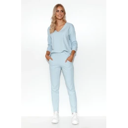 Elegantná dámska tepláková súprava. Minimalistická blúzka má hlboký výstrih do V, dlhé rukávy a zaujímavé plastické prešívanie. Na prednej strane je našitá jemná aplikácia s písmenom M. Dámska blúzka pôsobí na siluete mimoriadne elegantne. Dokonale ju dopĺňajú nohavice s rovnými nohavicami. Aj tie majú prešívanie, ktoré súprave dodáva biznis šik nádych. Na bokoch sú prístupné našité vrecká. V páse je do nohavíc všitá hrubá elastická šnúrka. Vďaka tomu nohavice ešte lepšie sedia na ženskej postave.