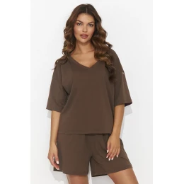 Tento ľahký a vzdušný dámsky komplet vyrobený z mäkkého úpletu zmení váš prístup k pohodliu. Blúzka má srdiečkový výstrih doplnený rozšírenými rukávmi lemovanými elegantnou blúzkou. Vďaka voľnému strihu blúzky sa pohodlne nosí, zatiaľ čo voľné šortky s bočnými vreckami jej dodávajú uvoľnený a športový štýl. Tento komplet je ideálny na každodenné nosenie, či už na športové aktivity, stretnutie s priateľmi alebo do práce. Je k dispozícii vo viacerých farbách, ktoré ponúkajú rozmanitosť podľa vkusu každej ženy. Štýl, pohodlie a modernosť, všetko, čo potrebujete v jednom súbore.