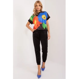 Tato velurová souprava je ideální pro ty, kteří si cení pohodlí a stylu na každý den. Skládá se z halenky a kalhot, které tvoří harmonickou dvojici ležérního vzhledu. Halenka, vyrobená z měkkého polyesteru, je opatřena potiskem, který jí dodává individuální nádech. Její krátké rukávy jí dodávají lehkost a ležérnost, ideální pro teplé dny. Kalhoty v jednobarevném provedení jsou dlouhé a pohodlné. Díky vysokému pasu se stahovací šňůrkou v pase se přizpůsobí siluetě pro pohodlné celodenní nošení. Boční nakládané kapsy jsou navíc praktickým prvkem pro bezpečné uložení drobných předmětů. Stahování nohavic na šňůrku dodává kalhotám ležérní vzhled a zároveň jim dodává nádech sportovního looku. Díky svému ležérnímu stylu se tato velurová souprava stane nezbytnou součástí vašeho každodenního šatníku a dodá pohodlí a styl v každé situaci.
