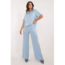 Elegantná dámska súprava, ktorá spája klasický štýl s pohodlím. Je vyrobená z vysokokvalitnej zmesi bavlny, elastanu a viskózy, čo zaručuje pohodlné nosenie a skvelé prispôsobenie sa postave. Hladký materiál jej dodáva univerzálny charakter, takže je skvelou voľbou na bežné nosenie, do práce aj na formálne príležitosti. Košeľa dlhšieho strihu s krátkymi rukávmi má klasický golier a gombíky, zatiaľ čo doplnkové zaväzovanie v páse jemne zvýrazňuje pás. Nohavice s vysokým pásom a širokými nohavicami zabezpečujú voľnosť pohybu, zatiaľ čo bočné vrecká dodávajú funkčnosť. Ideálna voľba pre ženy, ktoré oceňujú eleganciu a pohodlie v každodennom stylingu!