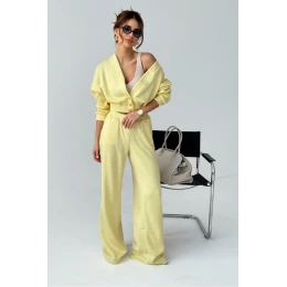Táto dámska súprava je štýlovou a pohodlnou kombináciou elegancie a každodenného pohodlia. Voľný sveter s bláznivým výstrihom a zapínaním na gombíky poskytuje voľnosť pohybu a dokonale sa prispôsobí postave. Široký elastický lem v spodnej časti dodáva štruktúru a jemne zvýrazňuje pás. Široké nohavice sú stelesnením pohodlia a elegancie, so vsadenými vreckami na bokoch a elastickým pásom, ktorý zaručuje ideálne prispôsobenie. Súprava je vyrobená z mäkkého, na dotyk príjemného materiálu a je vhodná na každodenné nosenie, ako aj na elegantnejšie štýly. Možno ju nosiť spolu alebo kombinovať s inými kúskami oblečenia, čím sa vytvoria nekonečné módne kombinácie.