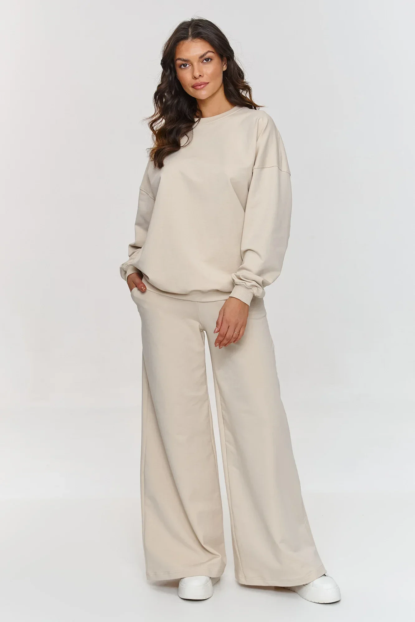 Tento teplákový set je ideální volbou pro ženy, které ocení funkčnost a styl. Sestava se skládá z oversized mikiny s dlouhými rukávy a volných kalhot, které vytvářejí pohodlný, ale stylový celek. Díky širokému střihu kalhoty poskytují plnou volnost pohybu a elastický pas se přizpůsobí postavě. Navíc jsou rozšiřovány ke spodu, což dává sestavě výjimečný a dynamický charakter. Mikina s klasickým kulatým výstřihem a rukávy zakončené pružnými lemy doplňují celek, vytvářejí pohodlný a zajímavý set. Teplákový oblek je vyroben z měkkého a příjemného materiálu, který zaručuje pohodlí každý den. Díky jednoduchému, ale efektnímu střihu se sestava skvěle hodí do různých situací. Náš teplákový set spojuje pohodlí, funkčnost a moderní vzhled. Hodí se jak na odpočinek doma, tak na setkání s přáteli, nákupy nebo do práce. Set skvěle ladí s oblíbenými teniskami, tvoří stylovou, pohodlnou a módní stylizaci. bavlna 95%