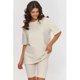 Klasika v nejlepším provedení! Tento dvoudílný komplet spojuje volný tričko s přiléhavými límci, vytvářejíc minimalistický a stylový outfit. Límce vyrobené z pruhovaného materiálu jsou must-have na léto. Skvěle se přizpůsobují postavě, zdůrazňují tvary, ale zároveň zaručují pohodlí díky elastickému materiálu. Délka límců je pohodlná a skvěle ladí s volnějšími tričky nebo topy. Tričko v tomto setu má oversized střih, který poskytuje plnou volnost pohybu. Krátký rukáv a kulatý výstřih mu dodávají klasický, univerzální vzhled. Set je vyroben z bavlny s přídavkem elastanu, díky čemuž je plastický a dokonale se přizpůsobuje tělu, zaručující volnost a pohodlí. Jeho všestrannost z něj činí ideálního společníka pro každý den, odpočinek doma, fyzickou aktivitu, výlety do města nebo setkání s přáteli. Můžete nosit celý bavlněný set společně nebo kombinovat jednotlivé kusy s jiným oblečením. Tričko se skvěle hodí k
