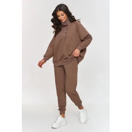 Jednoduchý a zároveň mimořádně stylový set s mikinou s knoflíky je skvělou volbou pro milovnice minimalismu a pohodlí. Bez kapuce, ale s maximálním pohodlím, mikina volného střihu s decentními knoflíky dělá tento set mimořádně univerzálním a hodí se na mnoho příležitostí. Teplákové kalhoty mají volný střih a manžety u nohavic, které zajistí ideální přizpůsobení a pohodlí po celý den. Elastický pas zajišťuje, že kalhoty jsou pohodlné a neomezují pohyb. Volná mikina má klasický střih bez kapuce, což umožňuje perfektní padnutí pod kabát nebo bundu. Navíc má stojánek zdobený stylovým detailem v podobě kovových knoflíků. Díky přírodnímu materiálu je tento set skvělou volbou jak pro volný den doma, rychlé nákupy, tak i pro setkání s přáteli nebo cyklistické výlety. Můžete ho nosit jako celek nebo kombinovat jednotlivé kousky s jiným oblečením, vytvářející mnoho módních setů. Investujte do pohodlí a nadčasového stylu,