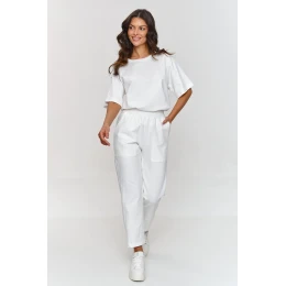 Tento pohodlný teplákový set je ideální volbou pro každodenní outfit a aktivní odpočinek. Má volný svetr s kulatým výstřihem zakončeným jemným lemem a raglánovými rukávy, které jsou skvělé pro ty, kteří chtějí opticky upravit ramena. Klasické kalhoty s přímými nohavicemi mají gumu v pasu, která umožňuje přizpůsobení se postavě, a velké nášivky kapes přidávají stylový akcent a funkcionalitu. Toto spojení kousků oblečení vytváří harmonický a pohodlný celek. Jednoduchý a volný střih tohoto outfitu z něj dělá nadčasový a univerzální, zachovávajíc přitom volnost a trendy vzhled. Teplákový set je vyrobený z prodyšného bavlněného materiálu, což ho činí praktickým i během teplejších dní. Tento set se skvěle hodí na každodenní vycházky, nákupy, setkání s přáteli nebo jiné fyzické aktivity. Tento teplákový set je kombinací funkčnosti a stylu, ideální pro ty, kteří chtějí být pohodlní, aniž by ztratili módní vz