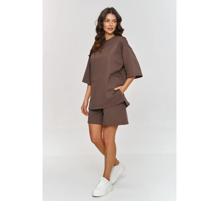 Tento pohodlný teplákový set je ideálním řešením pro ženy, které si cení pohodlí a nadčasovosti v každodenních stylizacích. Přesný střih trička zaručuje plnou volnost pohybu a stylový vzhled. Krátký rukáv a klasický kulatý výstřih činí z tohoto setu ideální nezávaznou základnu pro každodenní stylizace. Kraťasy mají elastický pas, co zajišťuje správné přizpůsobení a boční kapsy zdůrazňují jejich funkčnost. Volný střih kalhot a široké nohavice zajišťují plnou volnost pohybu a kratší délka z nich činí ideální volbu na teplé dny. Jednoduchý, ale efektní teplákový set spojuje minimalistický design s pohodlím, vytvářejíc skvělou možnost pro každodenní stylizace. Je to must-have na relaxaci doma, setkání s přáteli nebo krátké výlety. Jeho všestrannost však umožňuje také jeho využití při různých fyzických aktivitách. bavlna 95%