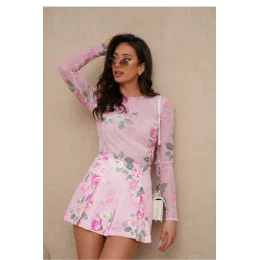 Elegantná a štýlová dámska súprava, ktorá spája rafinovanosť s moderným dizajnom. Blúzka z ľahkého, priehľadného tylu s dlhými rukávmi a okrúhlym výstrihom dodáva outfitu ženskú eleganciu a rafinovanosť. Sukňa-šortky sú funkčným a moderným riešením, zapínajú sa na skrytý zips, poskytujú pohodlie pri nosení a kontúry na prednej strane im dodávajú elegantný charakter a ľahkosť. Farebná potlač priťahuje pozornosť a dodáva celku jedinečný výraz. Ideálna voľba na špeciálne príležitosti, spoločenské stretnutia alebo módne mestské outfity. Zloženie blúzky: 70 % viskóza, 30 % elastan Zloženie sukne-šortiek: 95 % viskóza, 5 % elastan
