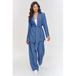 Tento dámský komplet byl navržen s ohledem na ženy, které hledají spojení stylu, pohodlí a moderní elegance. Sako s delším volným střihem dodává outfitu moderní charakter a vázaný pásek umožňuje přizpůsobení postavě a zdůraznění pasu. Nemá podšívku, což ho činí lehčím a volnějším. Kalhoty s širokými nohavicemi podtrhují módní vzhled a elastický pas zajistí maximální pohodlí. Model je vyroben z lehkého, strukturovaného materiálu, který zdůrazňuje jeho výjimečnost a třídu. Další výhodou je možnost nošení každého kusu samostatně, vytvářející různorodé a originální outfity. Díky jednoduchému, ale efektnímu střihu je tento komplet skvělým řešením jak pro výlety s přáteli, tak i do kanceláře, na obchodní schůzky a jiné formální události, kde chcete vypadat profesionálně a zároveň nechcete ustoupit pohodlí.