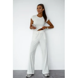 Súprava doplnená viskózou s prídavkom elastanu je ideálnou voľbou na každý deň aj na bežnejšie udalosti. Súprava obsahuje tričko s krátkymi rukávmi a klasickým okrúhlym výstrihom, ktorý jemne zvýrazňuje postavu a zaručuje pohodlie pri nosení. Súpravu dopĺňajú dlhé nohavice s elastickým pásom a šnúrkou na stiahnutie, ktoré umožňujú ideálne prispôsobenie pásu. Na bokoch sú praktické vrecká. Vďaka ľahkému, priedušnému materiálu s prímesou elastanu je súprava mäkká, elastická a pohodlná, skvelá na relaxáciu aj každodenné aktivity.