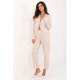 Táto dámska súprava v ležérnom štýle je ideálnou ponukou na každodenné nosenie pre ženy, ktoré oceňujú pohodlie a jemnú eleganciu. Je vyrobená z mäkkého, elastického materiálu maslového typu (viskóza s prídavkom elastanu), ktorý sa vyznačuje výnimočnou jemnosťou a príjemným pocitom. Mikina s golierom a dlhými rukávmi s gombíkom v tvare srdca dodáva súprave ženský nádych. Nohavice s vysokým pásom majú pohodlný elastický pás, rovné nohavice a praktické bočné vrecká. Na spodnej časti nohavíc a páse sú umiestnené ozdobné gombíky, ktoré sú štýlovým detailom, ktorý podčiarkuje výnimočný charakter súpravy. Súprava je vhodná ako pohodlný a módny každodenný styling, hladká, všestranná a nadčasová.