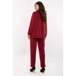 Táto dámska súprava v ležérnom štýle je ideálnou kombináciou pohodlia a moderného vzhľadu. Je vyrobená z veľmi mäkkého, príjemného materiálu a poskytuje maximálne pohodlie pri nosení. Sako s dlhými rukávmi sa zapína na gombíky a je zdobené ozdobnými prúžkami a aplikáciou na hrudi, čo súprave dodáva módny, športovo-elegantný charakter. Nohavice so zúženými nohavicami a vysokým pásom majú praktické bočné vrecká a šnúrku v páse, vďaka ktorej si ich môžete prispôsobiť svojej postave. Pruhy pozdĺž nohavíc zdôrazňujú dynamický štýl celej súpravy. Súprava sa bude skvele hodiť na každodenné uhladené, štýlové a mimoriadne pohodlné oblečenie.