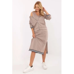 Tento dámsky ležérny komplet je ideálnou voľbou na každý deň a spája v sebe pohodlie a ženský charakter. Je vyrobený z mäkkého materiálu (viskóza s prídavkom elastanu), ktorý zaujme svojou jemnosťou, hladkosťou a výnimočným dotykom. Mikina so zapínaním na zips má dlhé rukávy, praktické vrecká a ozdobné sťahovacie prúžky na manžetách, ktoré celku dodávajú športový nádych. Šaty s ozdobným zakončením v midi dĺžke, širokými ramienkami a výstrihom do V dokonale ladia s mikinou, čím vytvárajú ucelený a moderný outfit. Tento komplet sa hodí ku každodennému oblečeniu, zaručuje pohodlie a voľnosť pohybu a zároveň vyzerá štýlovo a moderne.