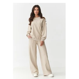 Vsadíte na spojení pohodlí a módního vzhledu s dámským teplákovým setem, který se skvěle hodí jak do každodenního života, tak i na volný čas nebo relaxaci doma. Vyrobený z měkké, prodyšné pleteniny z 95% bavlny a 5% elastanu, zaručuje pohodlí nošení a skvělé přizpůsobení postavy bez omezení pohybu. Horní část setu je klasická mikina s kulatým výstřihem a jemně sníženou linií ramen. Má lehce oversized střih, který dodává stylizaci volnosti a moderního charakteru. Její výjimečnost zdůrazňuje vyšívaná aplikace s logem vpředu, která dodává celku originalitu a decentní styl. Kalhoty se vyznačují módním střihem s širokými nohavicemi, které se krásně usazují při pohybu a dodávají postavě lehkost a vyváženost proporcí. Elastický pas a praktické kapsy zvyšují funkčnost a pohodlí nošení. Ideální volba na každé roční období, teplákový set s širokými nohavicemi a vyšíváním je must-have v ženském šatníku. Pohodlí, k