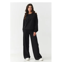 Vsadte na spojení pohodlí a módního vzhledu s dámským teplákovým kompletem, který je ideální jak na každodenní nošení, tak i na volné výlety nebo relaxaci doma. Vyrobený z měkké, prodyšné látky z 95% bavlny a 5% elastanu, zaručuje pohodlí při nošení a skvělé přizpůsobení postavě bez omezení pohybu. Horní část setu je klasická mikina s kulatým výstřihem a jemně sníženými rameny. Má lehce oversized střih, který stylizaci dodává uvolněnost a moderní charakter. Její výjimečnost zdůrazňuje vyšívaná aplikace s logem na přední straně, která celku dodává originalitu a jemný styl. Kalhoty se vyznačují módním střihem s širokými nohavicemi, které se krásně usazují při pohybu a dodávají postavě lehkost a vyvažují proporce. Elastický pás a praktické kapsy zvyšují funkčnost a pohodlí nošení. Ideální volba na každé roční období, teplákový set s širokými nohavicemi a vyšíváním je must-have v ženském šatníku. Pohod