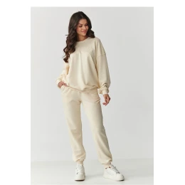 Stylový teplý set pro ženy, který kombinuje moderní design s výjimečným pohodlím nošení. Vyrobený z vysoce kvalitního materiálu složeného z 95 % bavlny a 5 % elastanu, zajišťuje měkkost, pružnost a ideální přizpůsobení postavě. Jedná se o skvělou volbu na každý den, hodí se doma, při procházkách, nákupech nebo víkendovém odpočinku. Hlavním znakem tohoto setu je vyšitá aplikace se logem značky na přední straně mikiny, která mu dodává originální charakter a módní výraz. Mikina má volnější střih s obnovenou linií ramen a je ukončena pohodlnými pružnými lemy na rukávech a dole, což jí dodává ležérní styl. Kulatý výstřih je také zakončen decentním lemem, což zdůrazňuje jeho nadčasovost. Kalhoty jsou vybaveny elastickým pasem a lemy na nohou, díky čemuž se skvěle přizpůsobují postavě a zajišťují pohodlí po celý den. Tento teplý set je ideální kombinací funkčnosti a stylu. Hodí se jak jako celek, tak nošený samosta