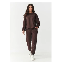 Stylová tepláková sada pro ženy, která kombinuje moderní design s výjimečným pohodlím. Vyrobena z vysoce kvalitní látky z 95% bavlny a 5% elastanu, zajišťuje měkkost, pružnost a dokonalé přizpůsobení postavě. Je to skvělá volba na každý den, bude se hodit doma, při procházkách, nákupech nebo víkendovém odpočinku. Hlavním prvkem této sady je vyšívaná aplikace se logem značky na přední straně mikiny, která jí dodává originální charakter a módní výraz. Mikina má volnější střih s obnovenou linií ramen a je ukončena pohodlnými manžetami na rukávech a dole, což jí dodává ležérní styl. Kulatý výstřih je také ukončen decentní manžetou, což zdůrazňuje jeho nadčasovost. Kalhoty mají elastický pas a manžety na nohavicích, díky čemuž se skvěle přizpůsobují postavě a zajišťují pohodlí po celý den. Tato tepláková sada je ideální kombinací funkčnosti a stylu. Hodí se jak jako sada, tak i samostatně. Univerzální střih pa