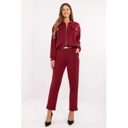 Dámsky ležérny set vyrobený z mäkkého a pohodlného flanelového materiálu. Set pozostáva zo saka so zipsom a nohavíc s ozdobným opaskom s prackou v páse, čím sa vytvára štýlové a pohodlné oblečenie na každý deň. Sako má stojačik, dlhé rukávy a náprsné vrecká s príklopkou, ako aj jemné brošne na vreckách ako elegantný detail. Nohavice s vysokým pásom a zúženými nohavicami majú bočné vrecká, čím sa spája pohodlie s moderným strihom. Hladký vzor a kombinácia viskózy a elastanu zaručujú mäkkosť, pružnosť a pohodlie pri nosení. Tento set je ideálny na každodenné nosenie, poskytuje voľnosť pohybu a elegantný, ležérny vzhľad.