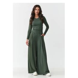 Tento set je ideální nabídkou pro ženy, které hledají spojení pohodlí, stylu a jemnosti. Vyrobený z měkké, příjemné na dotek viskózy, perfektně se přizpůsobuje siluetě, poskytuje volnost pohybu a pohodlí po celý den. Vrchní částí sestavy je přiléhavý top s dlouhým rukávem, který se vyznačuje jemným ruchem na bocích. Tento ženský detail nejen zdůrazňuje pas, ale také celku dodává elegantní, avšak nenáročný charakter. Toto spojení jednoduchosti s módním detailu dělá top skvělým nejen jako součást setu, ale i samostatně v mnoha stylizacích. Široké, volně padající kalhoty jsou zárukou pohodlí a stylu v jednom. Díky elastickému pasu a volnému střihu se skvěle hodí do pohybu a boční kapsy jim přidávají funkčnost. Toto je ideální střih jak pro nošení doma, tak i ve streetových stylizacích. Dámská sestava je k dispozici v módních, univerzálních barvách: antracitová, černá, čokoládová, khaki a bordová. Sáhněte po pohodl