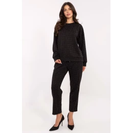 Stylový a pohodlný dámský teplákový set je nabídkou pro ženy, které ocení eleganci v každodenním outfitu. Sada se skládá z mikiny a kalhot, vytvářející harmonický celek s výrazně ženským charakterem. Model je vyroben z měkké směsi viskózy a polyesteru, která se skvěle přizpůsobuje postavě, poskytuje pohodlí a estetický vzhled. Celý povrch materiálu zdobí jemná aplikace z flitrů, dodávající setu elegantní, příležitostný styl. Kalhoty s vysokým pasem, rovnými dlouhými nohavicemi a šněrováním v pase zdůrazňují pas a zajišťují ideální přizpůsobení. Boční, vsazené kapsy přidávají praktičnost a volnost v každodenním používání. Tento set se skvěle hodí na mnoho příležitostí, je ideální do práce, na schůzky i na každý den. Spojuje pohodlí teplákové soupravy s elegancí příležitostného stylu, vytvářející univerzální a moderní vzhled.