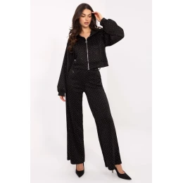 Elegantní a pohodlný dámský teplý set je ideální kombinací elegance a pohodlí každý den. Sada se skládá z mikiny s kapucí a šňůrkami a kalhot s gumou v pasu, vytvářející módní a zároveň praktický celek. Model je vyroben z vysoké kvality směsi viskózy a polyesteru s různorodou fakturou materiálu, která se krásně skládá a zaručuje pohodlí nošení. Celý povrch zdobí efektní aplikace z flitrů, dodávající sadě elegantní charakter a decentní lesk. Kalhoty s vysokým pasem, širokými, dlouhými nohavicemi a bočními kapsami s potutelním zaručují pohodlí a volnost pohybů. Mikina s dlouhým rukávem dokonale doplňuje celek, činí sada ideální na každodenní módní stylizace, od volných výstupů po setkání v elegantní, městském stylu. Tento set je kombinací pohodlí tepláku a rafinovaného vzhledu, který vám umožní vypadat stylově a cítit se volně v každé situaci.