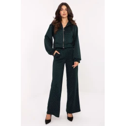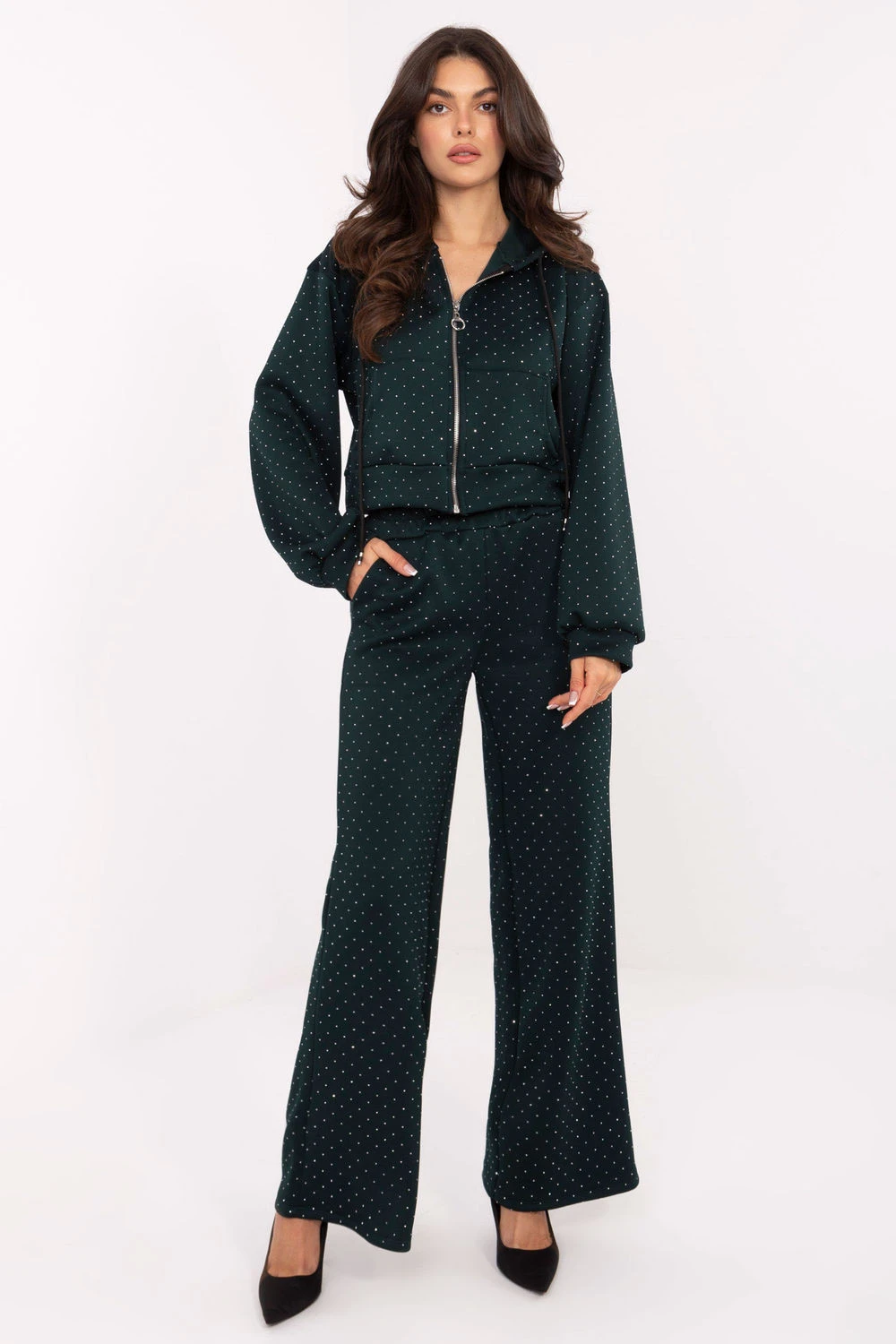 Elegantní a pohodlná dámská souprava dresů je ideální kombinací elegance a pohodlí na každý den. Souprava se skládá z mikiny se zipem a kapucí a kalhot s elastickým pasem, vytvářející módní a zároveň praktický celek. Model je vyroben z vysoce kvalitní směsi viskózy a polyesteru s různorodou fakturou materiálu, která se krásně skládá a zajišťuje pohodlí při nošení. Celý povrch zdobí efektní aplikace z lesklých kamenů, která dodává soupravě elegantní charakter a decentní lesk. Kalhoty s vysokým pasem, širokými, dlouhými nohavicemi a bočními kapsami zaručují pohodlí a volnost pohybu. Mikina s dlouhým rukávem dokonale doplňuje celek, činí soupravu ideální na každodenní stylizace, od volných výletů po setkání v elegantním, městském stylu. Tato souprava je kombinací pohodlí dresu a rafinovaného vzhledu, který vám umožní vypadat stylově a cítit se volně v každé situaci. polyester 30%