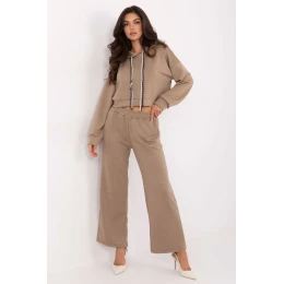Tento dámský teplákový set spojuje eleganci a pohodlí, ideální pro každodenní casual stylizace. Sestava se skládá z mikiny s kapucí a šňůrkami a kalhot s vysokým pasem a vsazenou gumou v pase, vytvářející pohodlný a stylový vzhled. Vyrobený z směsi viskózy a polyesteru, set je příjemný na dotek, elastický a poskytuje volnost pohybu. Celý povrch materiálu zdobí efektní aplikace z jete, která dává sestavě jemný lesk a eleganci. Kalhoty s širokými, dlouhými nohavicemi a bočními kapsami s zipem zvyšují pohodlí používání, zatímco dlouhý rukáv mikiny a kapuce se šňůrkami doplňují funkční design. Je to ideální volba pro ženy, které chtějí spojit pohodlí teplákové soupravy s elegantním vzhledem v každodenních stylizacích.