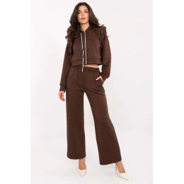 Tento dámský souprava tréninkový spojuje eleganci a pohodlí, ideální pro každodenní stylování ve stylu casual. Souprava se skládá z mikiny s kapucí a šňůrkami a kalhot s vysokým pasem a vsazenou gumou v pasu, vytvářející pohodlný a stylový vzhled. Vyrobený z směsi viskózy a polyesteru, souprava je příjemná na dotek, elastická a poskytuje volnost pohybu. Celý povrch materiálu zdobí efektní aplikace z flitrů, která dává soupravě jemný lesk a eleganci. Kalhoty s širokými, dlouhými nohavicemi a bočními kapsami s průchodem zvyšují pohodlí použití, dlouhý rukáv mikiny a kapuce s šňůrkami doplňují funkční design. Je to ideální volba pro ženy, které chtějí spojit pohodlí tepláku s elegantním vzhledem v každodenním stylingu.