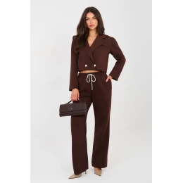 Elegantní dresová sada: sako a kalhoty, které spojují eleganci s každodenním pohodlím. Vyrobena z mimořádně příjemného materiálu typu měkké máslo, jemného a hladkého, zajišťuje maximální pohodlí při nošení a skvělé přizpůsobení postavě. Sako s límci a límečkem, zapínací na knoflíky, dodává celku moderní, ležérní charakter. Dlouhý rukáv ozdobený knoflíky představuje stylový detail, který zdůrazňuje precizní dokončení. Kalhoty s vysokým pasem, dlouhými rovnými nohavicemi a vázaným pásem zaručují pohodlí a volnost pohybu. Model je vybaven bočními kapsami, které zvyšují funkčnost sady. Hladký vzor a pečlivě vybraná směs polyesteru, viskózy a elastanu zajišťují, že sada skvěle padne jak do každodenních stylizací, tak i do práce v módním a pohodlném provedení. Je to ideální nabídka pro ženy, které ocení styl, pohodlí a univerzálnost v jednom kompletu.