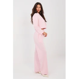 Elegantní dresový set: sako a kalhoty, které spojují eleganci s každodenním pohodlím. Vyrobeno z mimořádně příjemného materiálu, který je jemný, měkký a hladký, zajišťuje maximální pohodlí a skvělé přizpůsobení siluetě. Sako s límci a límečkem, zapínání na knoflíky, dodává celku moderní a ležérní charakter. Dlouhý rukáv s ozdobnými knoflíky je stylovým detail, který zdůrazňuje precizní provedení. Kalhoty s vysokým pasem, dlouhými přímými nohavicemi a vázaným pásem zaručují pohodlí a volnost pohybu. Model je vybaven bočními kapsami, které zvyšují funkčnost setu. Hladký vzor a pečlivě vybraná směs polyesteru, viskózy a elastanu zajišťují, že set se skvěle hodí jak do každodenních stylizací, tak do práce v módním a pohodlném provedení. Je to ideální nabídka pro ženy, které si cení stylu, pohodlí a všestrannosti v jednom setu.