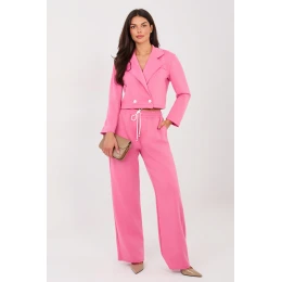 Elegantní komplet saka a kalhot: saka plus kalhoty, které spojují eleganci s každodenním pohodlím. Vyrobena z velmi příjemného materiálu typu měkké máslo, jemného a hladkého, poskytuje maximální pohodlí a skvělé přizpůsobení postavě. Sako s límci a límečkem, zapínací na knoflíky, dodává celku moderní, ležérní charakter. Dlouhý rukáv zdobený knoflíky je stylovým detail, který zdůrazňuje precizní zpracování. Kalhoty s vysokým pasem, dlouhými přímými nohavicemi a vázaným pásem zaručují pohodlí a volnost pohybů. Model je vybaven bočními kapsami, které zvyšují funkčnost kompletu. Hladký vzor a pečlivě vybraná směs polyesteru, viskózy a elastanu zajišťují, že komplet se perfektně hodí jak do každodenních stylizací, tak do práce v módním a pohodlném provedení. Jedná se o ideální nabídku pro ženy, které oceňují styl, pohodlí a univerzálnost v jednom kompletním outfitu.
