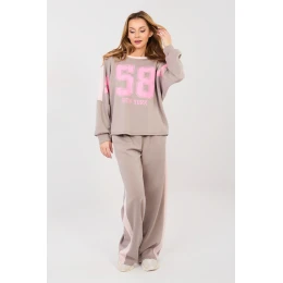 Dámský dresový set skládající se z mikiny a kalhot je pohodlný a stylový návrh pro každodenní outfit v casualovém provedení. Model se skvěle hodí jak na každý den, tak při procházkách nebo odpočinku, spojuje módní vzhled s maximálním pohodlím nošení. Ozdobné nápisy a čísla umístěné vpředu mikiny a na rukávech dodávají celku sportovní, moderní charakter. Set je vyroben z kvalitní směsi polyesteru, viskózy a elastanu, což zajišťuje měkkost, pružnost a dobré přizpůsobení se postavě. Mikina má dlouhý rukáv a klasický, kulatý výstřih. Kalhoty s dlouhými, širokými nohavicemi a vysokým pasem zaručují pohodlí a volnost pohybů. Praktické, boční kapsy zvyšují funkcionalitu setu. Dalším benefitem jsou pruhy na nohavicích a rukávech, které zdůrazňují sportovní styl a opticky zeštíhlují postavu.