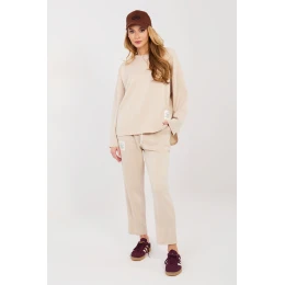 Dámský teplý set skládající se z mikiny a kalhot je ideální volbou pro každodenní outfit ve stylu casual, který kombinuje pohodlí s minimalistickým designem. Hladký střih dělá set univerzálním a skvěle se hodí jak doma, tak i při vycházkách do města nebo na procházky. Set je vyroben z vysoce kvalitní směsi polyesteru, viskózy a elastanu. Materiál je velmi měkký, jemný a příjemný na dotek, poskytující maximální pohodlí při nošení. Mikina s dlouhým rukávem a klasickým kulatým výstřihem má jemnou nášivku umístěnou v dolní části vpředu na levé straně, která dodává celku moderní nádech. Kalhoty s dlouhou délkou a se zužujícími se nohavicemi perfektně padnou na postavě. Vysoký pas a šňůrky na stahování v pase umožňují ideální přizpůsobení, a boční kapsy zvyšují funkčnost setu.