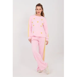 Tento dámský dresový set skládající se z mikiny a kalhot je ideální nabídkou pro každodenní nošení pro ženy, které oceňují pohodlí, volnost pohybu a módní, ležérní styl. Měkký materiál typu flís je neuvěřitelně jemný a příjemný na dotek, díky čemuž se set skvěle hodí jak pro domácí relaxaci, tak pro každodenní vycházky. Mikina s dlouhým rukávem s pruhem byla ozdobena decentním motivem srdíček na přední straně, který celku dodává ženský a dívčí charakter. Široké nohavice kalhot s módními pruhy opticky zúžují postavu, a vysoký pas krásně zdůrazňuje pas a zajišťuje pohodlí nošení. Nastavitelný pas s šňůrkami umožňuje ideální přizpůsobení, a boční kapsy zvyšují funkcionalitu setu. Jedná se o dresový set, který spojuje pohodlí s módním vzhledem. Ideální na procházky, nákupy, cestování nebo lenivé dny doma vždy, když chcete být pohodlně a stylově zároveň.