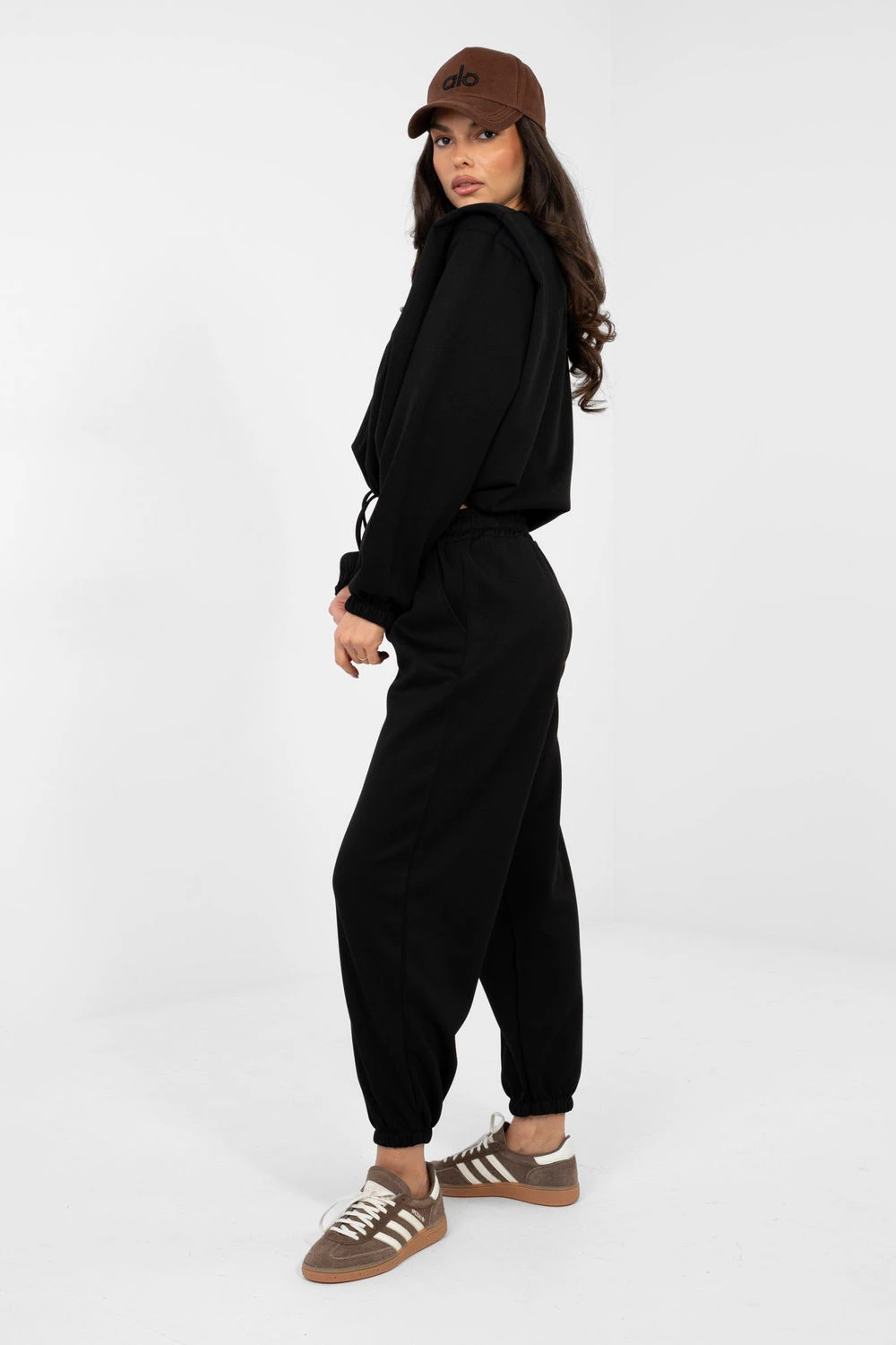 Dámský teplý komplet skládající se z mikiny a kalhot je skvělým návrhem na každý den pro ženy, které oceňují pohodlí a volný, casual styl. Hladký materiál podtrhuje minimalistický charakter setu a činí ho mimořádně univerzálním. Vyrobený z vysoké kvality směsi viskózy a elastanu, ohromuje materiálem typu měkké máslo, jemným a mimořádně příjemným na dotek. Materiál krásně padne na postavě, je elastický a zajišťuje maximální pohodlí při nošení po celý den. Mikina s dlouhým rukávem a klasickým, kulatým výstřihem má šněrování dole, které umožňuje regulaci a jemné zdůraznění pasu. Kalhoty s vysokým pasem a elastickým pásem zaručují ideální přizpůsobení. Dlouhé nohavice zakončené stahovacími manžetami dodávají sportovní charakter a boční kapsy zvyšují funkčnost. Jedná se o ideální volbu pro každodenní nošení, procházky nebo relaxaci v domácím útulku. Stylový, pohodlný a mimořádně příjemný komplet, kte