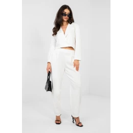 Elegantní dámský komplet skládající se z krátkého saka a dlouhých kalhot je skvělým návrhem do práce i na každý den. Klasický, hladký vzor zdůrazňuje nadčasový charakter setu a pečlivě vybraná tkanina (polyester, viskóza, elastan) zaručuje pohodlí, trvanlivost a estetický vzhled po celý den. Krátké sako s dlouhým rukávem je zdobeno límečky, které mu dodávají eleganci a profesionální vzhled. Dvojřadé zapínání na knoflíky přidává eleganci a jemně tvaruje postavu. Kalhoty s vysokým pasem krásně zdůrazňují pas a zužující se nohavice zjemňují nohy. Model bez klasického zapínání, s elastickým pásem vzadu, zaručuje pohodlí nošení a ideální přizpůsobení. Další výhodou jsou praktické boční kapsy. Materiál typu "máslo" je měkký, jemný a mimořádně příjemný na dotek.