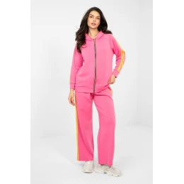 Pohodlný a stylový dámský set dresů je ideální nabídkou na každý den. Casual charakter setu se skvěle hodí pro každodenní aktivity, procházky nebo relaxaci, kombinující pohodlí s módním vzhledem. Mikina s dlouhým rukávem je vybavena praktickou kapucí a zipem, co zajišťuje pohodlí a možnost regulace. Model má boční kapsy, které zvyšují funkčnost. Dekorativní pruhy na rukávech dodávají celému outfitu sportovní a dynamický charakter. Kalhoty s vysokým pasem a dlouhými širokými nohavicemi zaručují volnost pohybu a moderní vzhled. Pruhy po stranách nohavic zdůrazňují sportovní styl setu a opticky zeštíhlují postavu. Set je vyroben z příjemné směsi polyesteru, viskózy a elastanu. Materiál je elastický, odolný a odolný proti mačkání, díky čemuž se set skvěle hodí do každodenního nošení. Pohodlný a módní set, který skvěle kombinuje sportovní volnost s moderním stylem. Materiál typu fleece je jemný, něžný a mimořádně příjemn