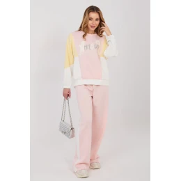 Mimořádně pohodlný dámský teplákový set vyrobený z velmi měkkého, jemného a příjemného materiálu typu "máslo". Tkanina z polyesteru, viskózy a elastanu je elastická, lehce se líná a dokonale padne na postavu, poskytujíc maximální pohodlí při každodenním nošení. Souprava se skládá z mikiny s dlouhým rukávem a kalhot s širokými, dlouhými nohavicemi. Mikina s klasickým, kulatým výstřihem je ozdobena efektním nápisem s flitry, který dodává celku moderní a ženský charakter. Kalhoty s vysokým pasem krásně zdůrazňují pas a zajišťují pohodlné nošení. V pasu jsou šňůrky na stahování, umožňující ideální přizpůsobení postavě. Praktické boční kapsy zvyšují funkčnost a široké nohavice dodávají outfitu volný, moderní vzhled. Jedná se o ideální set pro ženy, které oceňují spojení mimořádné měkkosti, pohodlí a módních detailů v každodenních stylizacích.