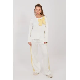 Stylový dámský teplákový komplet v casualovém provedení je ideální nabídkou na každý den. Kombinace pohodlí s módními detaily z něj činí skvělý set pro každodenní aktivity, procházky nebo setkání ve volném stylu. Komplet se skládá z mikiny s dlouhým rukávem a klasickým kulatým výstřihem a dlouhých kalhot s širokými nohavicemi. Hladký vzor zdůrazňuje univerzální charakter setu, díky čemuž se snadno sladí s různými doplňky. Mikina je zdobena efektním kontrastním mašlí na přední straně, což dodává celku ženský a decentní elegantní akcent. Kalhoty s vysokým pasem krásně modelují pas a elastický pás zaručuje pohodlné přizpůsobení postavě. Další výhodou jsou praktické boční kapsy a pruhy běžící podél nohavic, které dodávají sportovní charakter a opticky prodlužují nohy. Set je vyroben z příjemné směsi polyesteru, viskózy a elastanu, materiál je měkký, elastický a odolný proti vráskám, což zaručuje pohodlí noš