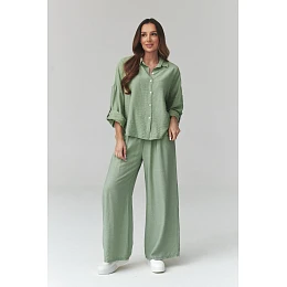 Táto štýlová dámska súprava v moderných odtieňoch je ideálnou voľbou na jar a leto. Súprava pozostáva z voľnej košele na gombíky a širokých nohavíc s elastickým pásom, ktoré zaručujú maximálne pohodlie a voľnosť pohybu. Tkanina je vyrobená z ľahkého, priedušného materiálu, je mäkká, priedušná a príjemná na pokožku, čo poskytuje pohodlie počas celého dňa. Táto dámska súprava košele a nohavíc je skvelým základom pre mnohé štýly. Spojte ju s teniskami, sandálmi alebo žabkami a vytvorte ležérny vzhľad alebo pridajte elegantné doplnky pre sofistikovanejší efekt. Vyrobené v Taliansku.