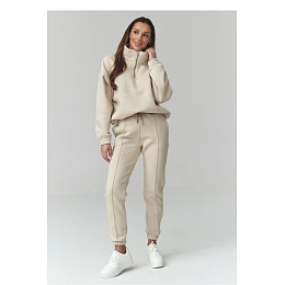 Táto štýlová dámska tepláková súprava v univerzálnej veľkosti je ideálnou kombináciou pohodlia a módneho vzhľadu. Je vyrobená z mäkkého, na dotyk príjemného materiálu a je ideálna na každodenné nosenie, ako aj počas víkendového oddychu alebo cestovania. Klasické farby dodávajú súprave univerzálny charakter a ľahko sa kombinujú s rôznymi štylizáciami. Ďalšou výhodou súpravy je ozdobné prešitie na bokoch nohavíc, ktoré opticky predlžuje nohy. Voľná tepláková súprava s krátkym zipsom pri krku a reguláciou na šnúrku v spodnej časti zaručuje pohodlie pri nosení a módny, športový vzhľad. Tepláky s elastickým pásom majú priliehavé nohavice zakončené lemami, ktoré zdôrazňujú moderný vzhľad.