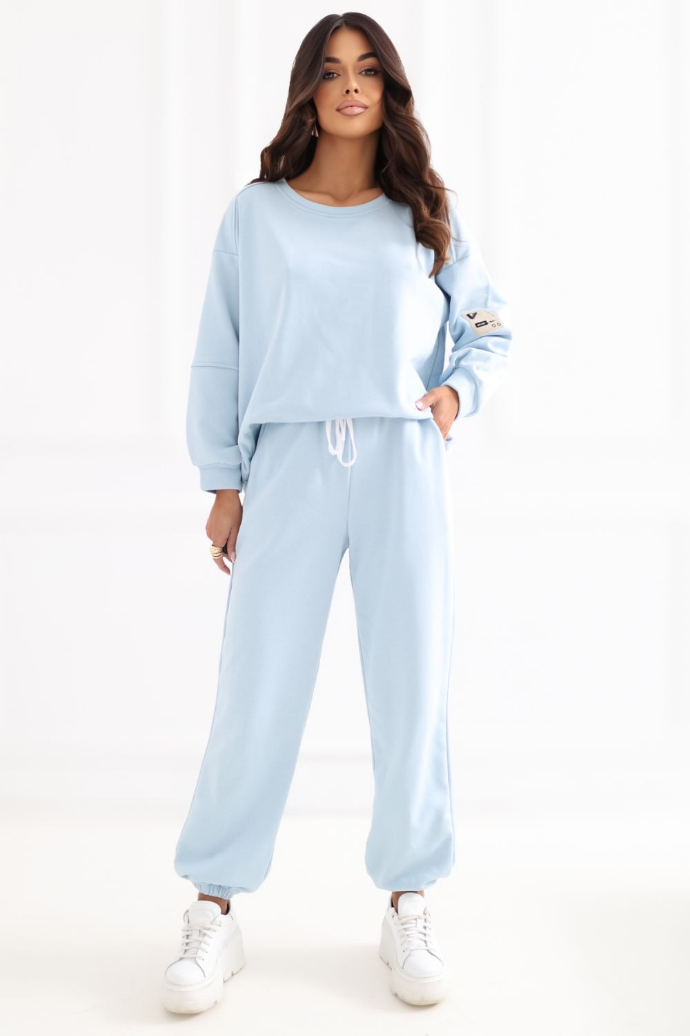 Sada tepláků skládající se z mikiny a kalhot je ideální nabídkou pro každodenní nošení pro ty, kteří ocení pohodlí a moderní styl. Hladký design dělá tuto sadu univerzální a snadno kombinovatelnou, skvěle se hodí jak doma, tak i venku. Mikina s dlouhým rukávem a klasickým, kulatým výstřihem zajišťuje pohodlnost nošení a volnost pohybu. Dekorativní nášivka na levém rukávu jí dodává jemný, moderní akcent. Kalhoty s dlouhými nohavicemi zakončenými lemy se skvěle přizpůsobují postavě. Vysoký komfort užívání zaručuje pružný pas s šňůrkou, který umožňuje individuální nastavení. Navíc je model vybaven praktickými bočními kapsami. Sada je vyrobena z měkké a příjemné směsi bavlny s elastanem, což zaručuje pohodlí, pružnost a trvanlivost. Jedná se o skvělou volbu pro každodenní střihy, které kombinují funkčnost s moderním vzhledem.