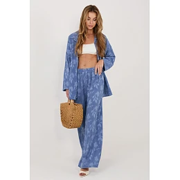 Dámský set skládající se z košile a kalhot je stylovým a pohodlným návrhem na každý den. Vyniká pestrým materiálovým vzorem, který celku dodává moderní a originální charakter. Košile s dlouhým rukávem, klasickým límečkem a zapínáním na knoflíky vypadá elegantně, ale zároveň volně, díky čemuž se skvěle hodí jak do každodenních, tak do více upravených stylizací. Kalhoty s dlouhými nohavicemi mají elastický pas s všitou gumou, co zajišťuje pohodlné přizpůsobení postavy a komfort při nošení po celý den. Navíc mají praktické boční kapsy. Set vyrobený z měkké a příjemné směsi viskózy a elastanu zaručuje lehkost, pružnost a volnost pohybů. Je to ideální volba pro ženy, které oceňují pohodlí spojené s módním vzhledem.